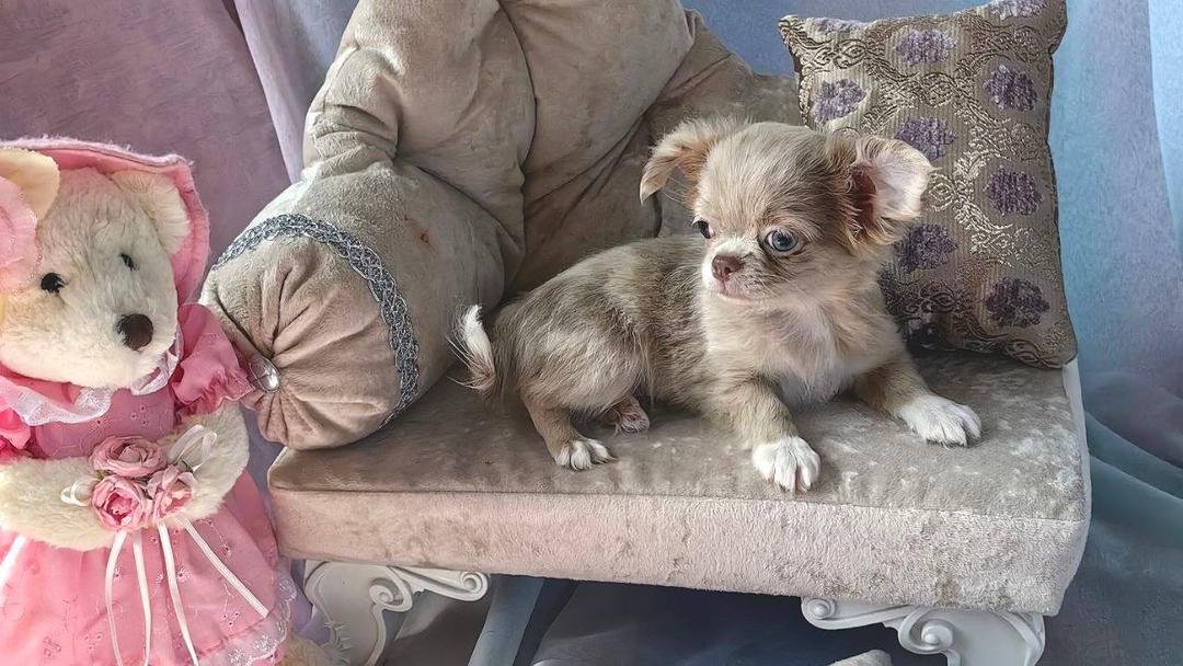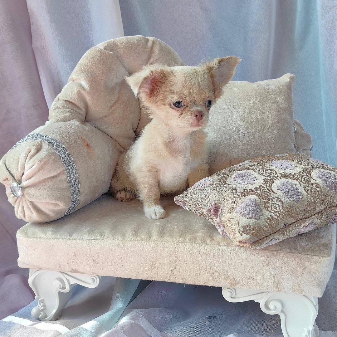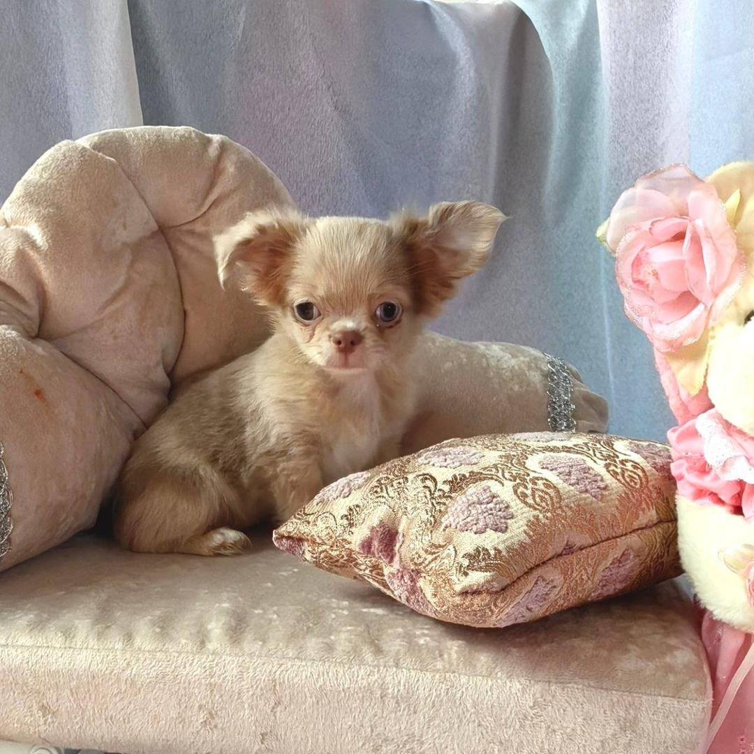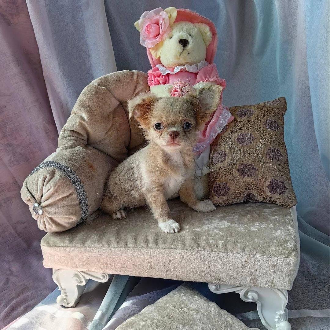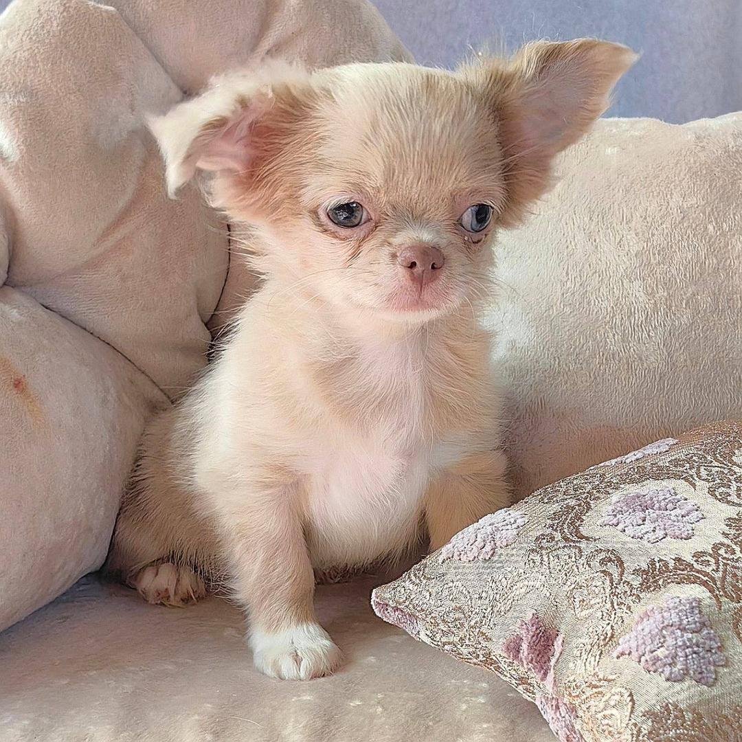 “Adorable and affectionate, this little female Chihuahua is a sweetheart! Her beautiful merle coat adds to her charm, and her big, loving eyes will capture your heart. Playful, loyal, and full of love, she’s the perfect companion for snuggles and adventures.”
